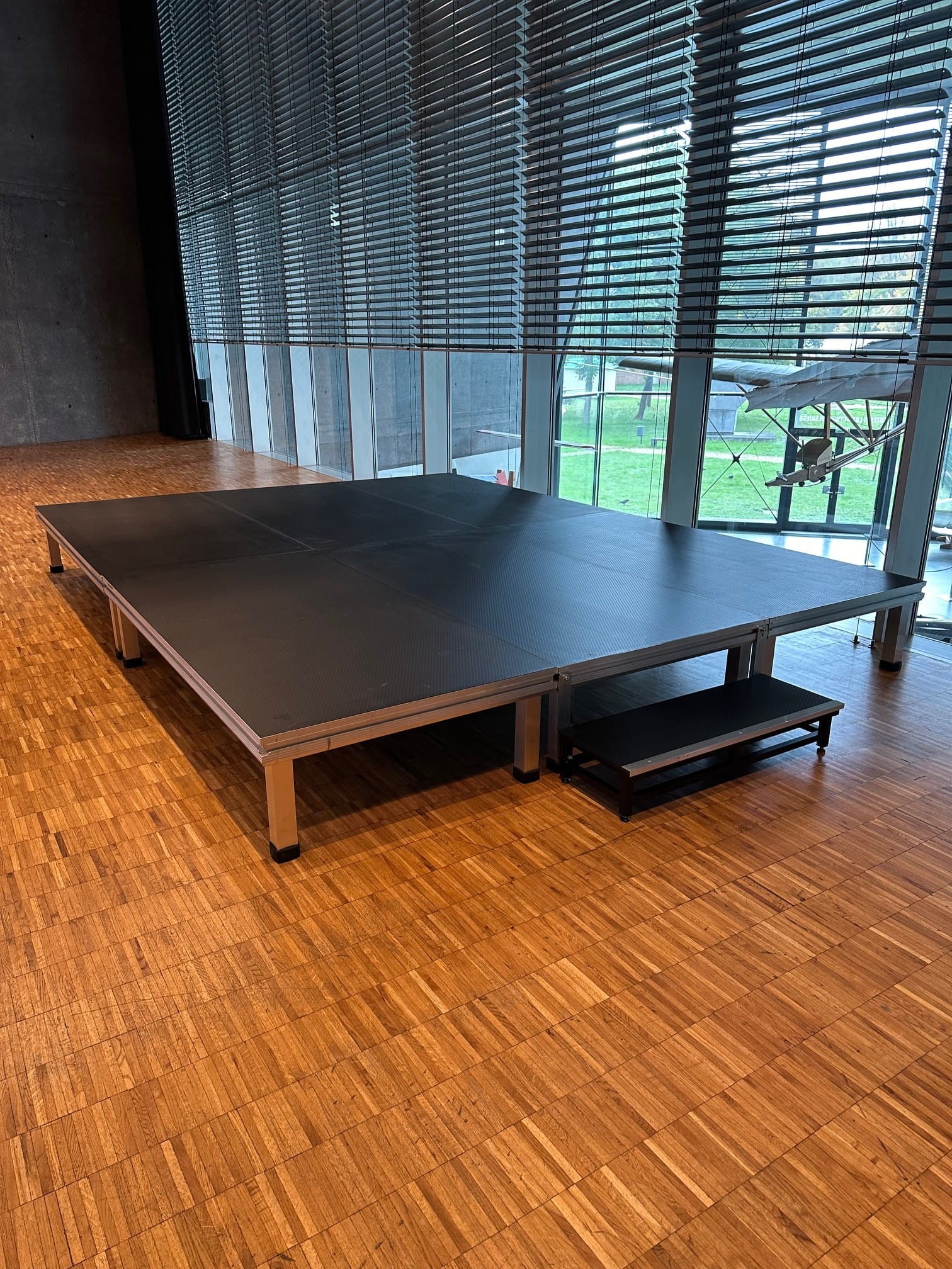 Profesjonalna, lekka i wytrzymała scena mobilna wykonana z podestów AluDeck. Idealna do zastosowań w szkołach, domach kultury, salach gimnastycznych oraz na małych eventach i występach artystycznych.