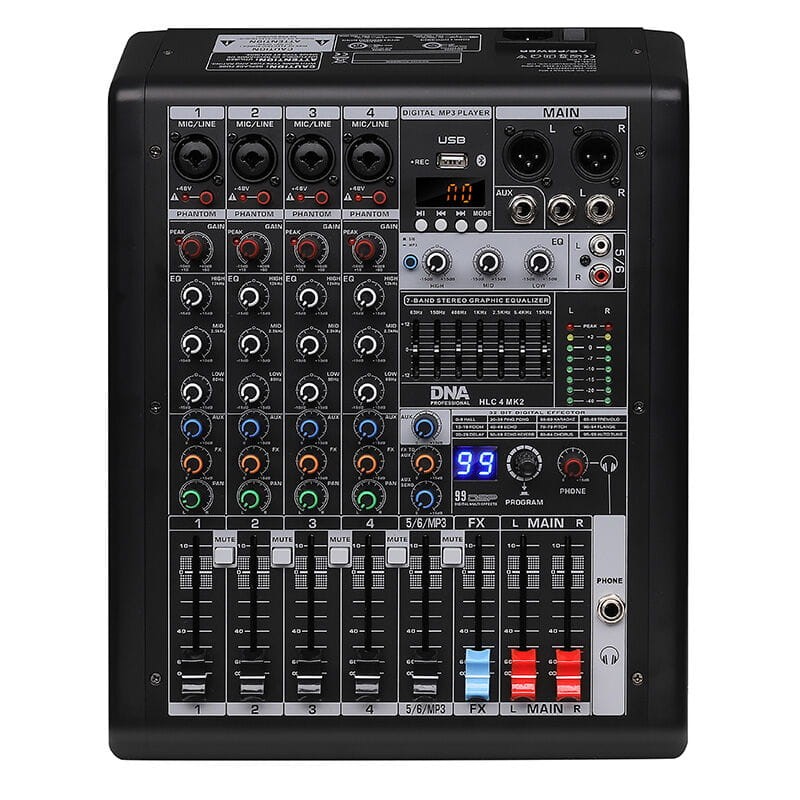 DNA HLC 4 MK2 to profesjonalny, analogowy mikser audio, wyposażony w cztery kanały wejściowe mono i jeden kanał wejściowy stereo, wysokiej klasy przedwzmacniacze, port USB z funkcjami MP3 i REC oraz standard bezprzewodowej komunikacji Bluetooth. Sprzęt doskonale sprawdza się jako mikser sceniczny podczas niewielkich koncertów i występów estradowych, na salach prób, a także w domowym studio nagrań.