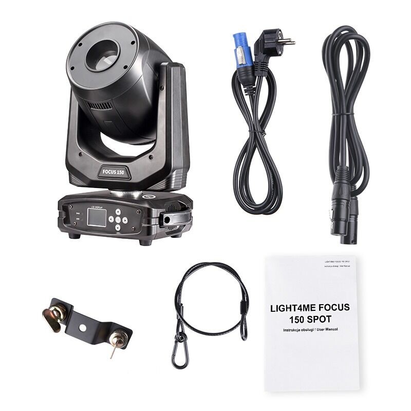 Light4Me Focus 150 Spot to profesjonalna głowica ruchoma LED, której źródłem światła jest dioda o mocy 150 watów. Głowa jest wyposażona w tarczę 9 kolorów, dwie tarcze gobo z 8 (statyczne) oraz 6 (rotacyjne) nowoczesnymi wzorami kształtującymi promień świetlny, a także obrotową pryzmę rozszczepiającą wiązkę. Ostrość plamy świetlnej może być regulowana za pomocą elektronicznego focusu. Głowica doskonale spisuje się na każdej scenie i tanecznym parkiecie. Możemy go wykorzystać zarówno w mobilnych i stałych instalacjach podczas muzycznych koncertów, pokazów, gali, występów w domach i ośrodkach kultury, a także na imprezach w klubach muzycznych, dyskotekach, podczas DJ party oraz jako oprawa oświetleniowa dla mobilnych DJ-ów, zespołów i firm eventowych