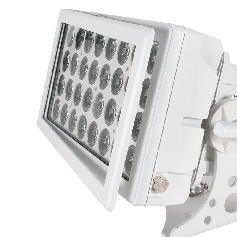 32 HEX Panel IP Pearl, posiadający oznaczenie ochrony IP65, jest wszechstronnym urządzeniem wash/blinder/color strobe do użytku wewnątrz i na zewnątrz. Wyposażono go w 32 żarówki LEDowe 12W HEX (6-IN-1 - RGBWA+UV), 8 indywidualnie sterowalnych sekcji ze Sterowaniem Stref Pikseli oraz 24-stopniowym kątem wiązki. Biała metalowa obudowa z oznaczeniem IP65 zapewnia ochronę przed zanieczyszczeniami - pyłem, piaskiem, wilgocią i płynami. Urządzenie wyposażono również w ściąganą magnetyczną ramkę, która pozwala na dodanie filtra rozpraszającego do zmiany kąta wiązki.