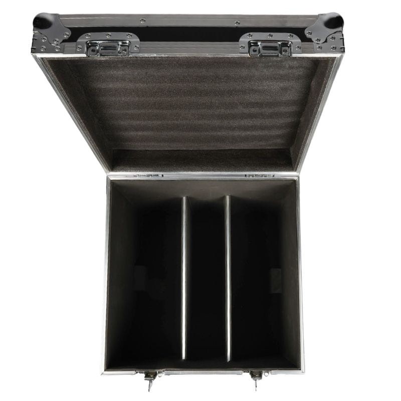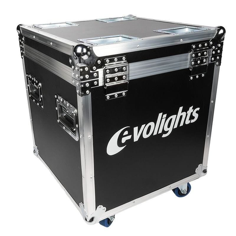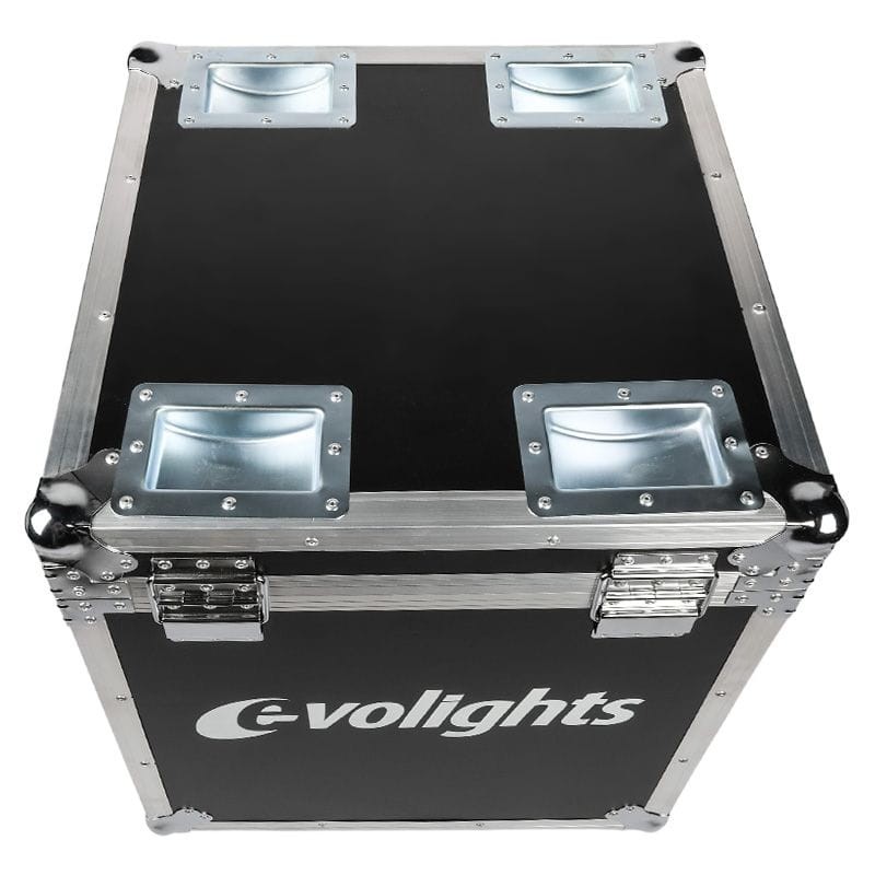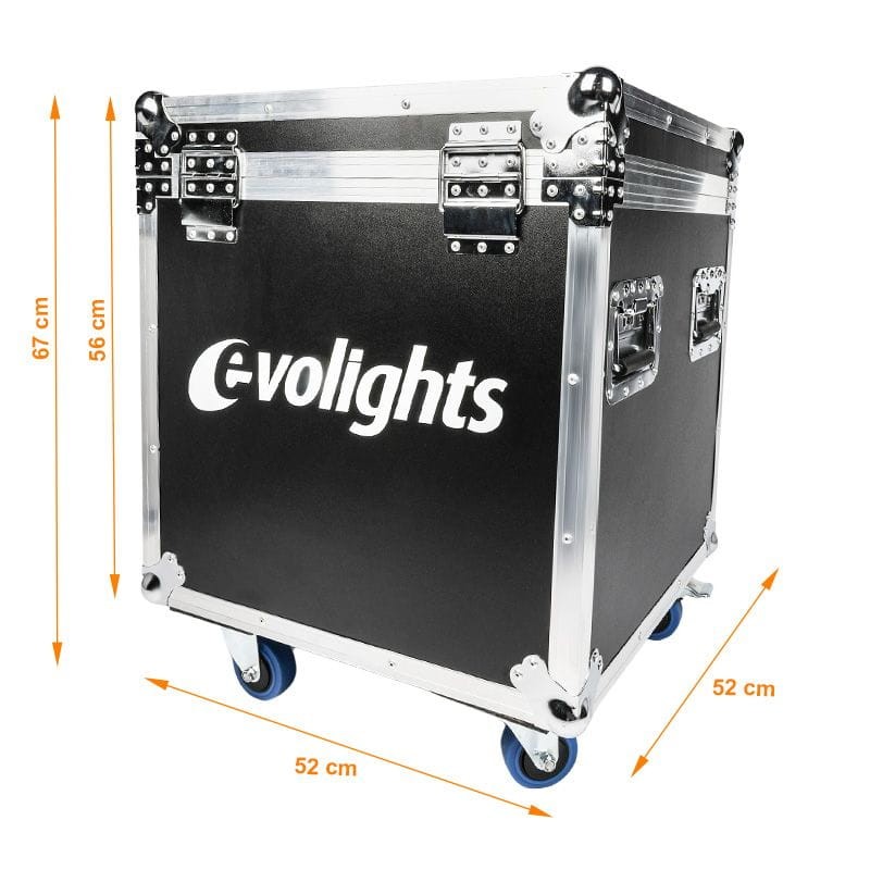 Evolights Lumeno Case 2in1 to ✅ profesjonalna i bardzo solidnie wykonana skrzynia transportowa na 2 reflektory estradowe Lumeno lub inne urządzenia o podobnych do tych reflektorów wymiarach. Kontener wykonany został z grubej, 7-milimetrowej sklejki pomalowanej specjalną, wodoodporną farbą. Jego krawędzie wzmocnione zostały aluminiowymi profilami. Na narożnikach znajdują się kulowe, chromowane osłony dodatkowo zabezpieczające konstrukcję oraz chroniące samo otoczenie skrzyni dzięki wyeliminowaniu ostrych krawędzi.