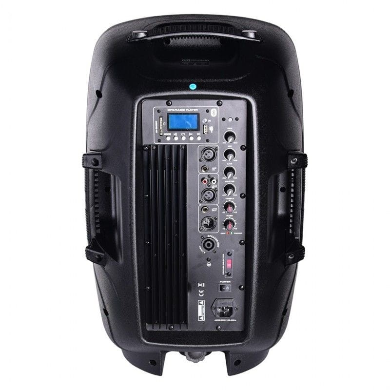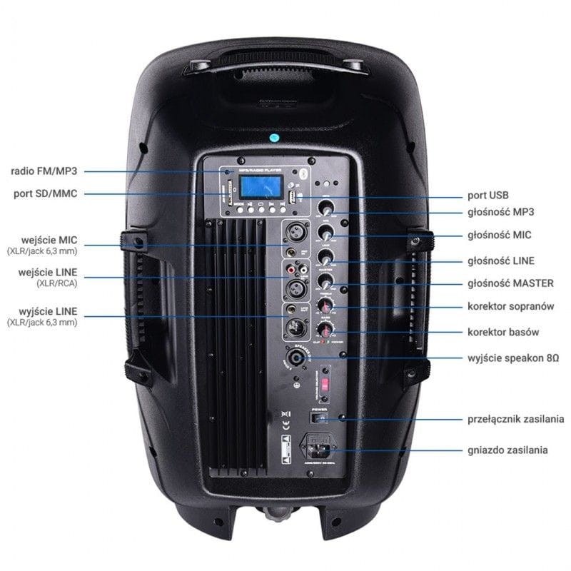Akumulatorowa kolumna audio wyposażona została w 12-calowy, podświetlany różnymi kolorami głośnik o mocy 200 watów, oraz wysokotonowy, 1-calowy driver z szerokim hornem. Jest zasilana za pomocą przewodu IEC. Na tylnym panelu znajduje się czytelny wyświetlacz LCD informujący o najważniejszych parametrach pracy kolumny. Użytkownik ma do dyspozycji mikrofonowe wejście typu XLR oraz jack 6,3 mm, liniowe wejście XLR oraz złącze stereo typu RCA (cinch), a także sygnałowe wyjście XLR i jack 6,3 mm. Kolumna może również współpracować z innymi głośnikami pasywnymi dzięki złączu speakon (Speaker Out 8Ω). Standard bezprzewodowej komunikacji Bluetooth pozwala na łączenie z różnymi urządzeniami zewnętrznymi. Dzięki niemu możemy przesyłać do kolumny sygnały dźwiękowe ze smartfonów, tabletów oraz innych urządzeń audio. Dźwięk może być również wprowadzany z plików MP3 przy wykorzystaniu portu USB lub SD/MMC. Sterowanie odtwarzaniem odbywa się za pomocą wygodnych przycisków. Dodatkowo grupa sześciu obrotowych potencjometrów pozwala kontrolować głośność sygnałów wejściowych oraz poziom tonów wysokich i niskich, a czerwona dioda LED informuje o pojawianiu się przesterowań.