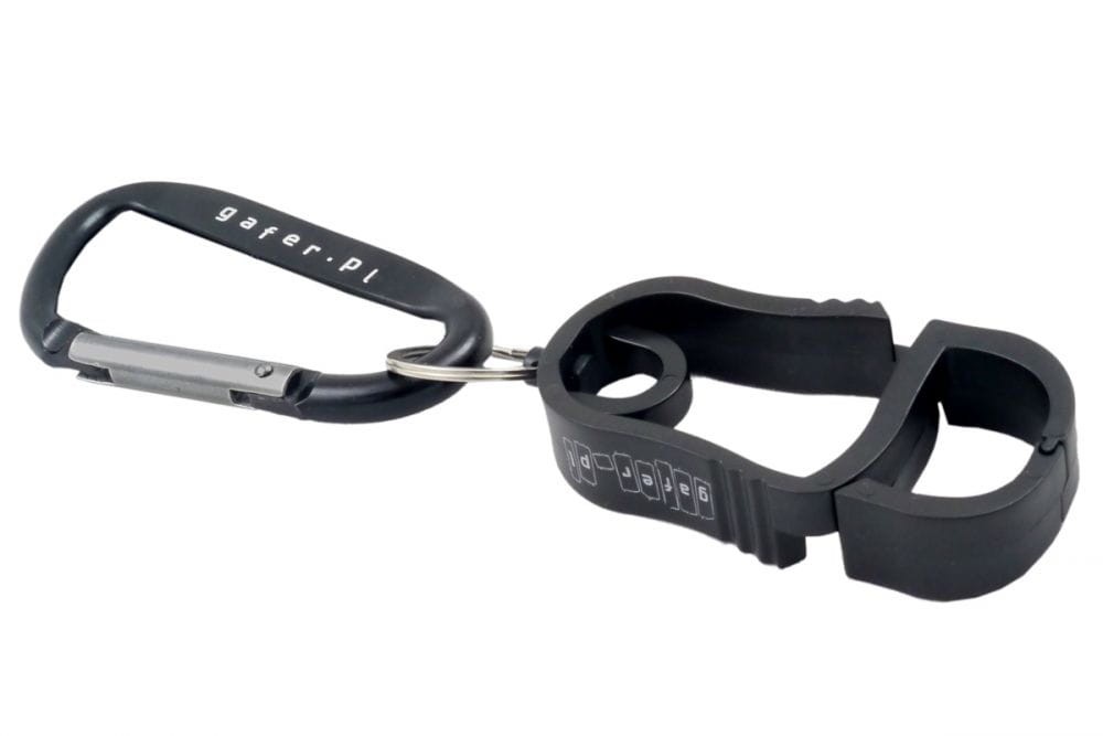 Uchwyt został stworzony z niezwykle mocnego plastikowego klipsa, który zapewnia bezpieczny chwyt rękawic. Mimo to, nie ma obaw przed uszkodzeniem materiału. Szczęki uchwytu mają bardzo szeroki rozstaw (50 mm) co umożliwia zastosowanie go w wielu innych sytuacjach. W komplecie znajduje się aluminiowy karabińczyk gafer.pl, który z łatwością zamocujesz na szlufce od spodni czy przy plecaku itp.