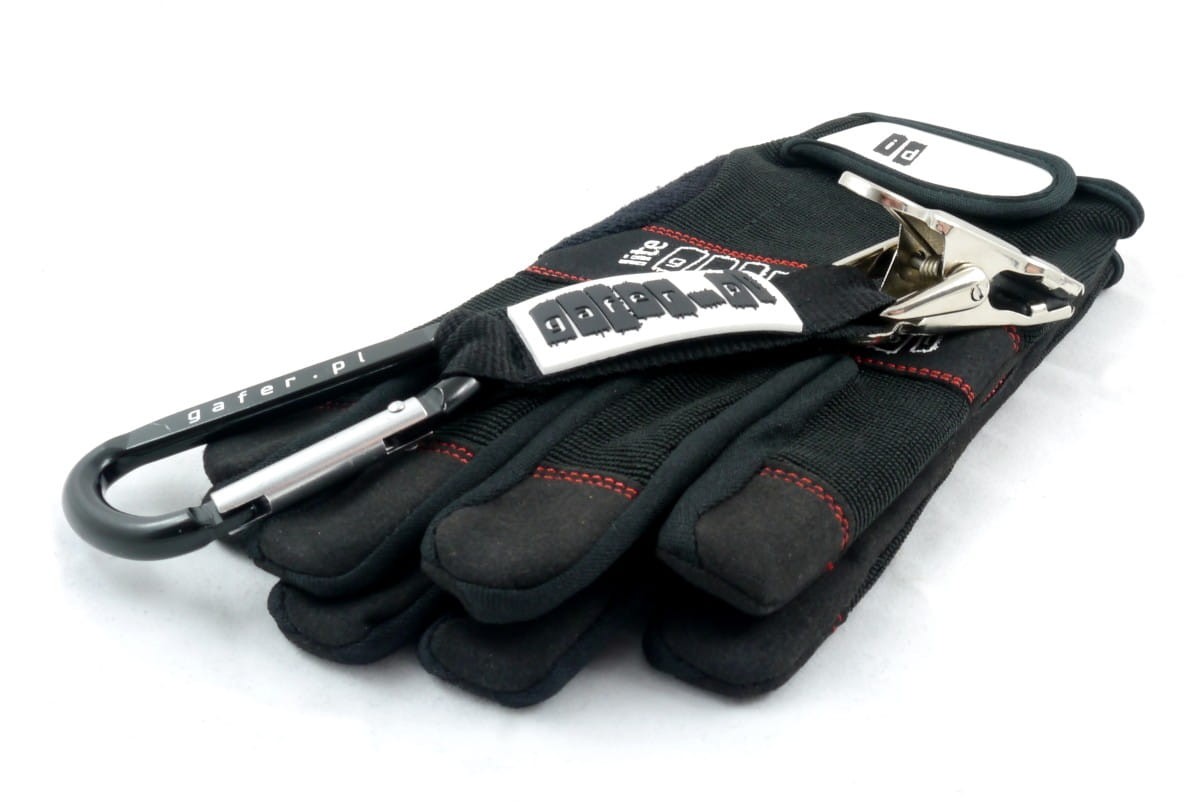 Dzięki wygodnemu, aluminiowemu karabińczykowi można z łatwością zawiesić go na szlufce od paska, ponadto mocny metalowy klips zapewnia proste zaczepienie rękawic, a jego gumowe wykończenie zapobiega niszczeniu się materiału.