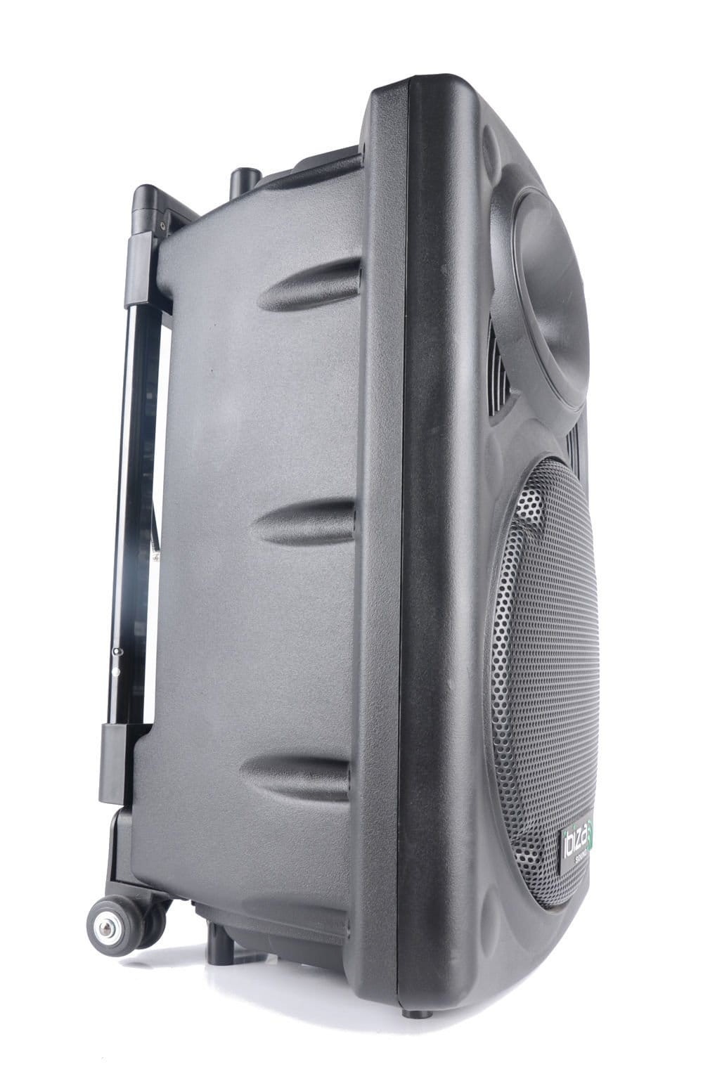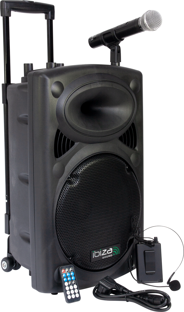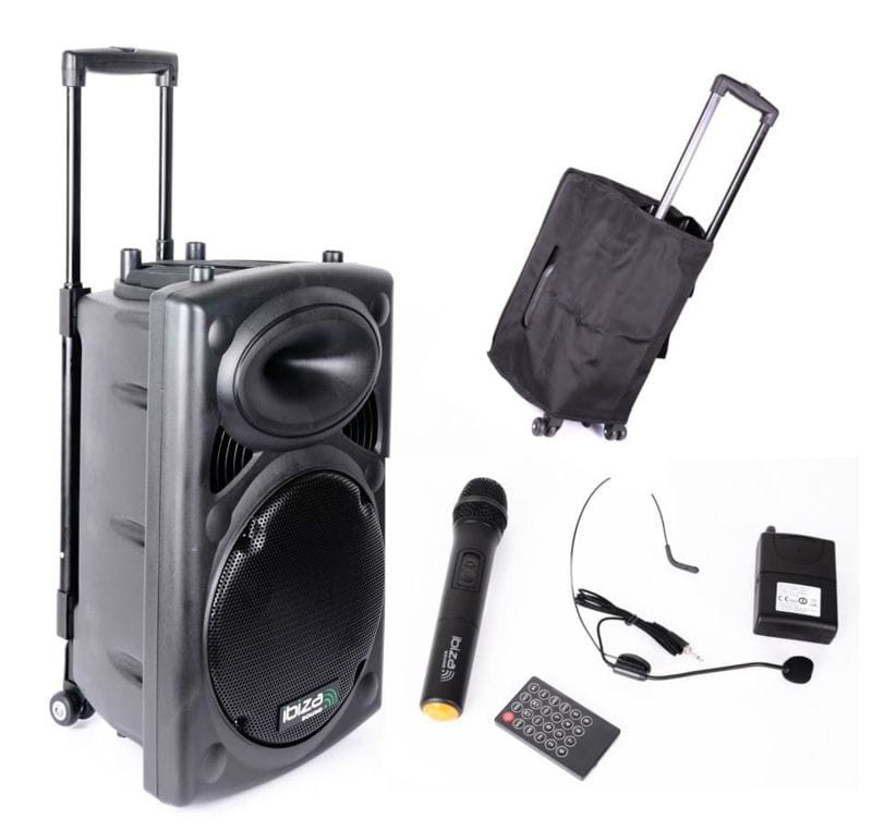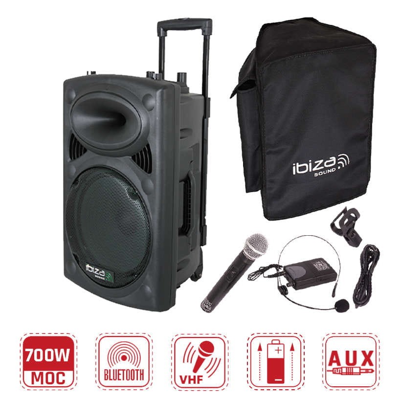 Ibiza PORT12VHF-BT to samodzielny, w pełni funkcjonalny system nagłośnieniowy - idealny w zastosowaniach mobilnych, dzięki wbudowanemu akumulatorowi wielokrotnego ładowania. Nadaje się m.in. do prowadzenia imprez karaoke. Zestaw składa się z wielofunkcyjnej aktywnej kolumny, dwóch mikrofonów bezprzewodowych, bezprzewodowego pilota sterującego oraz okablowania. Urządzenie zbudowane jest na wydajnym głośniku niskotonowym o średnicy 12", moc szczytowa kolumny wynosi aż 700W.