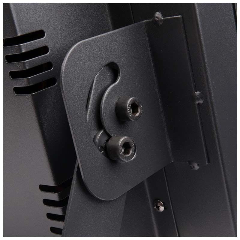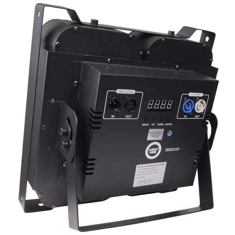 Light4Me Blinder LED 4x100W ma solidną, metalową obudowę, a dzięki dokręcanemu do niej ✅ uchwytowi montażowemu, reflektor może być ustawiony na podłożu pod odpowiednim kątem w stosunku do oświetlanej powierzchni. W przypadku potrzeby oświetlenia z góry, może być również zainstalowany na kratownicach i rampach oświetleniowych. Na tylnej ścianie urządzenia znajdują się gniazda zasilania typu powercon (w tym wyjście powercon ✅ „podaj dalej” umożliwiające przekazywanie napięcia bezpośrednio z urządzenia do urządzenia), 3-pinowe gniazda XLR służące do sterowania reflektorem za pomocą protokołu DMX oraz intuicyjny panel sterowania składający się z wyświetlacza i 4 przycisków. Możemy w prosty sposób wybrać jeden z 4 trybów pracy urządzenia: