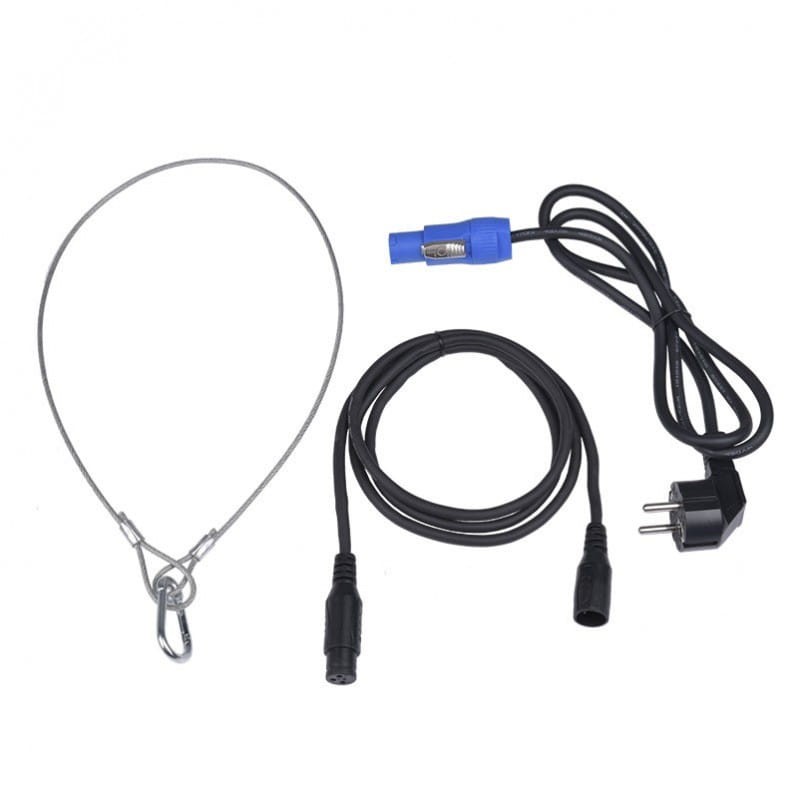 W zestawie: przewód zasilający, przewód DMX, linka bezpieczeństwa, instrukcja obsługi