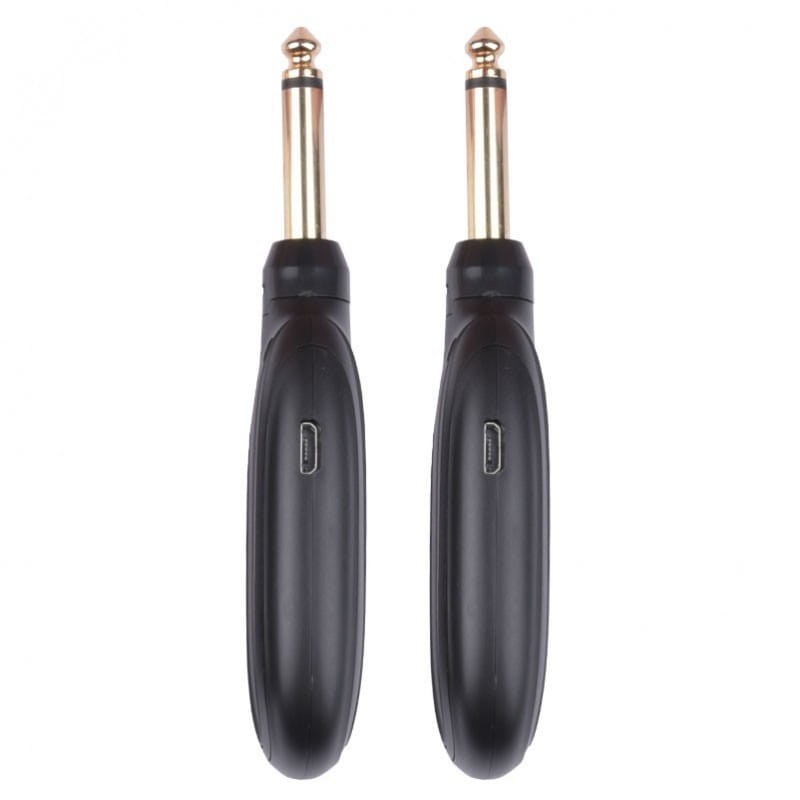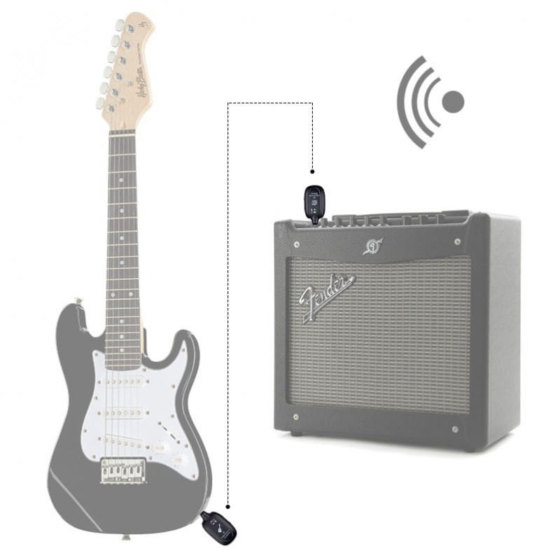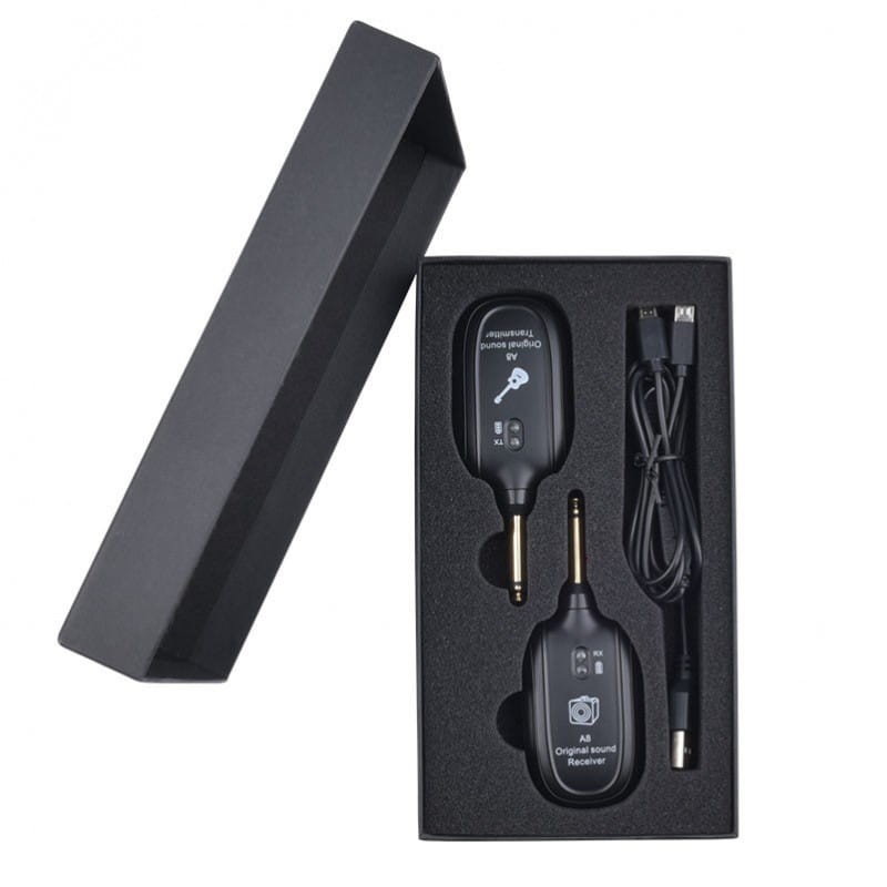 Gitarowy system bezprzewodowy NN A8 składa się z nadajnika i odbiornika fal radiowych UHF, z wewnętrzną baterią 3,7 wolta o pojemności 700 mAH, ładowaną za pomocą dołączonego kabla przez złącza micro USB. Czas ładowania wynosi dwie godziny, natomiast czas pracy bezprzewodowego zestawu do gitary około 4 godzin. Transmitery zamknięte zostały w czarnej, wykonanej z wytrzymałego tworzywa obudowie. Zakończone są wtykiem mono jack 6,3 mm, a na ich froncie umieszczono dwie diody LED. Jedna z nich informuje nas o poziomie naładowania akumulatora, natomiast druga o stanie sparowania obu urządzeń na jednym z pięciu dostępnych kanałów. Maksymalny zasięg zestawu wynosi około 30 metrów, a opóźnienie generowane przez urządzenie to zaledwie 4 ms, co gwarantuje nam wspaniałe wrażenia muzyczne. Jeśli zastanawiasz się jak bezprzewodowo połączyć gitarę z „piecem”, warto zastanowić się właśnie nad tym stosunkowo tanim zestawem bezprzewodowym do gitary, dostępnym w najlepszej cenie od sklepu muzycznego