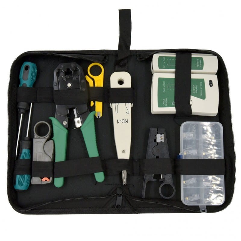 NN AR0811 to profesjonalny zestaw narzędzi do przygotowywania oraz testowania złączy, kabli, przewodów sieciowych i telekomunikacyjnych. Komplet zawiera kilkanaście akcesoriów ułatwiających pracę. Zaciskarka wtyków wyposażona została w obcinarkę, blokadę otwarcia przytrzymującą okablowanie i boczny mechanizm zaciskowy. Pasuje do złącz RJ45, RJ11 i RJ12. Ich przetestowanie umożliwia tester kabli, który pokaże ewentualne zwarcie, przerwanie toru elektrycznego oraz skrzyżowane lub odwrócone pary przewodów. Urządzenie działa w trybie autoskanu. Do wyboru mamy prędkość normalną lub szybką. Ponadto w zestawie znajduje się zaciskarka LSA z obcinaczką i wyciągaczem przewodów, która przystosowana jest do przewodów telekomunikacyjnych i teleinformatycznych, ściągacz izolacji, dwa narzędzia do cięcia oraz izolowania przewodów, a także śrubokręty płaski i krzyżakowy. Całość mieści się w wygodnym, składanym etui.