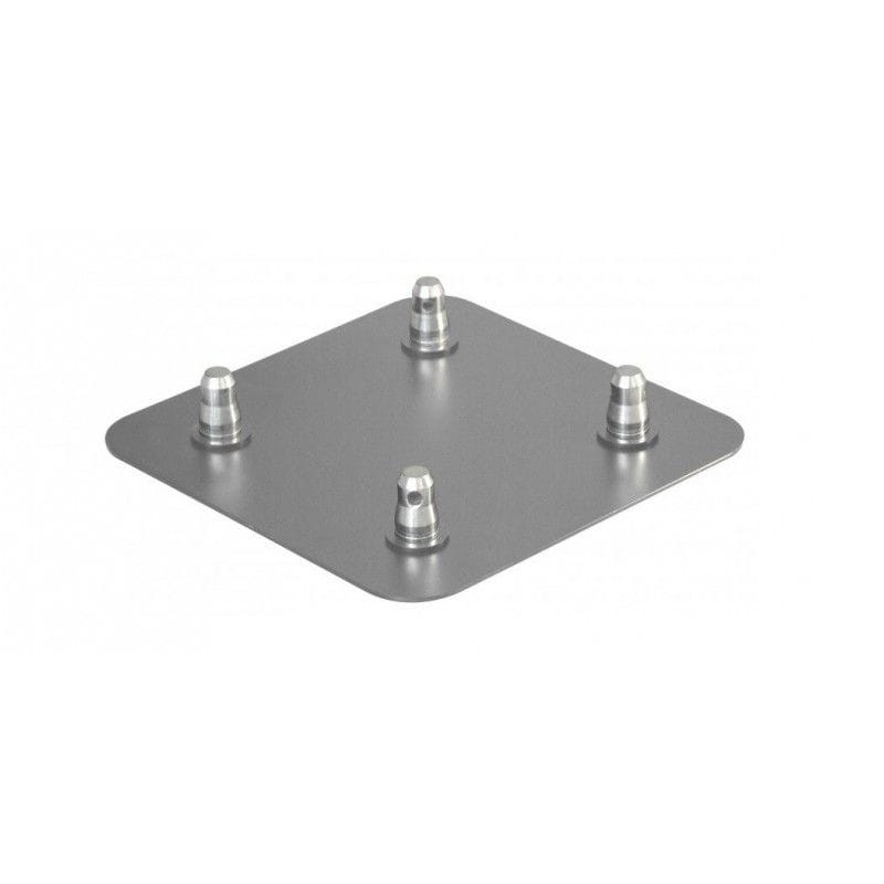 Aluminiowa podstawa montażowa typu „quadro system” marki Stand4Me, o wymiarach 31 x 31 cm, pod trawersy, kratownice, rampy i konstrukcje sceniczne, umożliwiająca ich ustawianie w pozycji pionowej. Płyta posiada 4 piny („beczki”) z zawleczkami, rozmieszczone na planie kwadratu. Ich rozstaw (liczony od środka osi obrotu pojedynczego pina) wynosi 239 mm. Dzięki temu podstawa idealnie pasuje do kratownic o szerokości 29 cm Alustage, Stand4me, zapewniając słupom dużą stabilność.