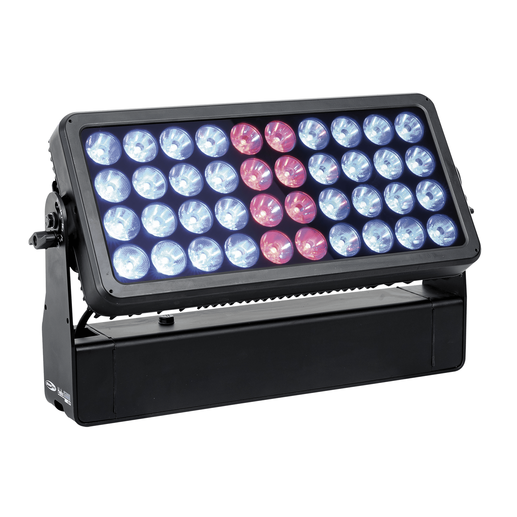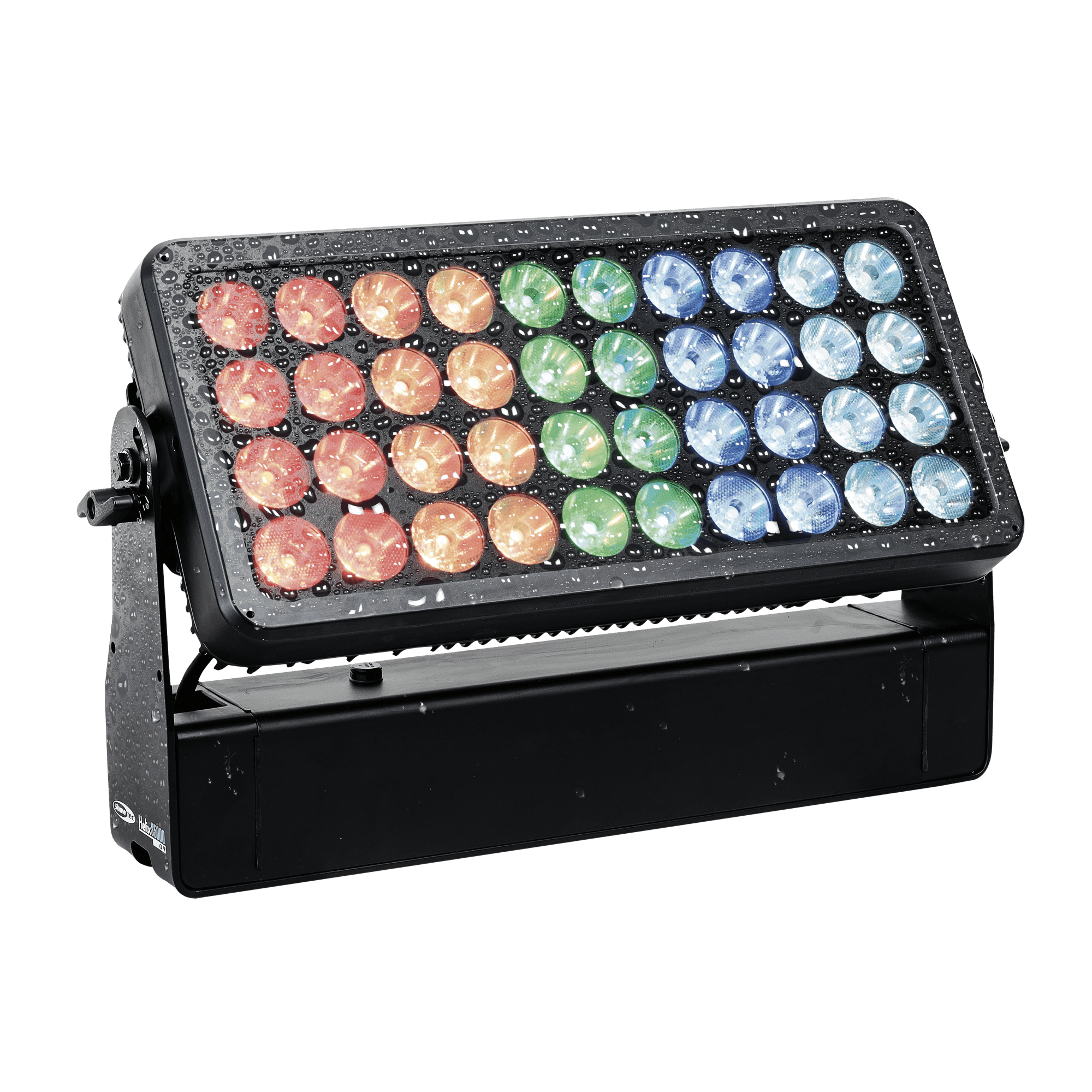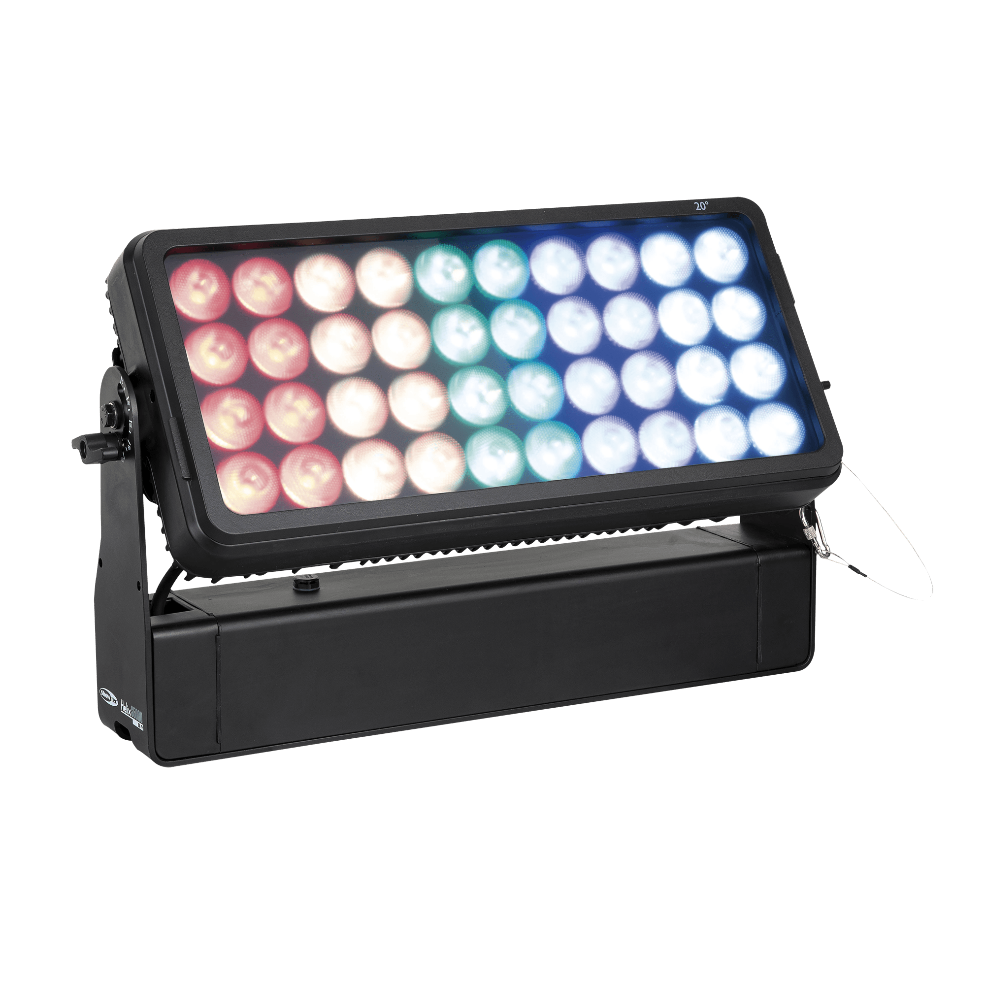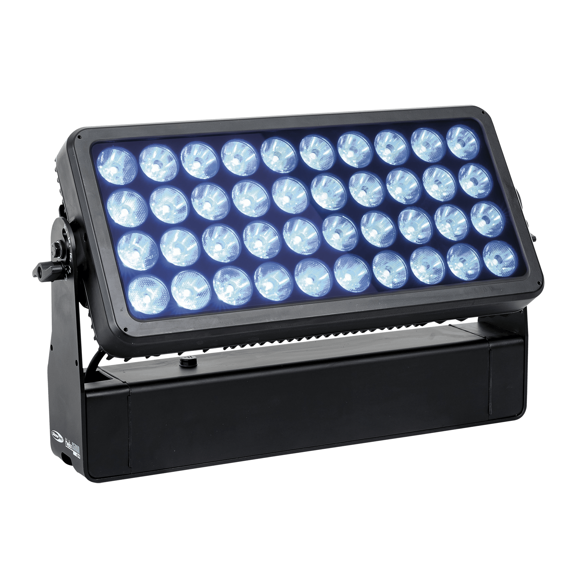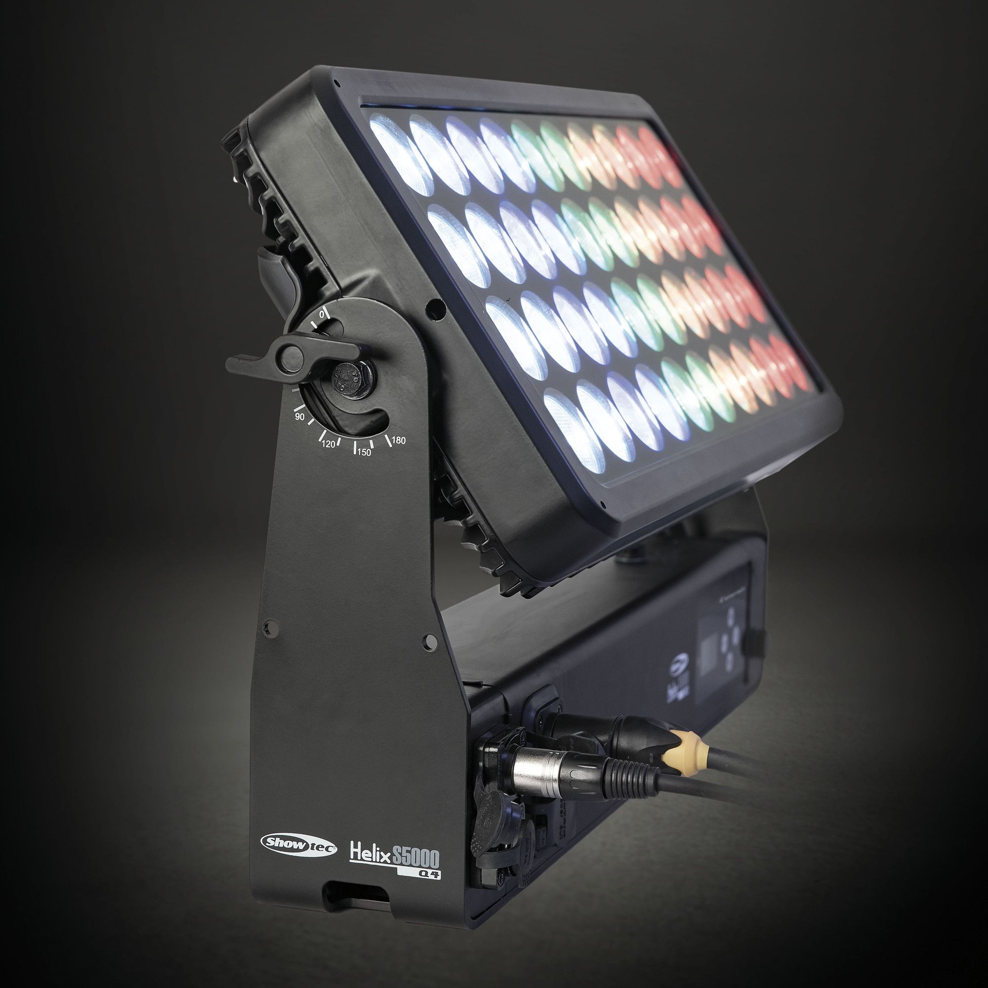 Showtec Helix S5000 Q4 to naświetlacz LED RGBW o mocy 40 x 10 W i stopniu ochrony IP65, przeznaczony do zastosowań zewnętrznych. Kąt wiązki wynoszący 10° można rozszerzyć do 20°, 40°, 15° x 60° i 90° za pomocą dedykowanego kształtownika wiązki. Diody LED Helix S5000 Q4 można podzielić na 5 oddzielnych sekcji, co pozwala na tworzenie oszałamiających efektów. Lampe można ręcznie obrócić o 180° i sterować nią za pomocą W-DMX (bezprzewodowo), DMX oraz Master/Slave w trybie ręcznym i automatycznym z wieloma wbudowanymi programami. Połączenie bezprzewodowe jest kompatybilne ze starszymi urządzeniami obsługującymi W-DMX, pod warunkiem użycia tylko jednego trybu (G3). Helix S5000 Q4 jest dostarczany z kablem powerCON True 1, panelem montażowym, gumowymi nóżkami i uchwytem Quick-Lock.