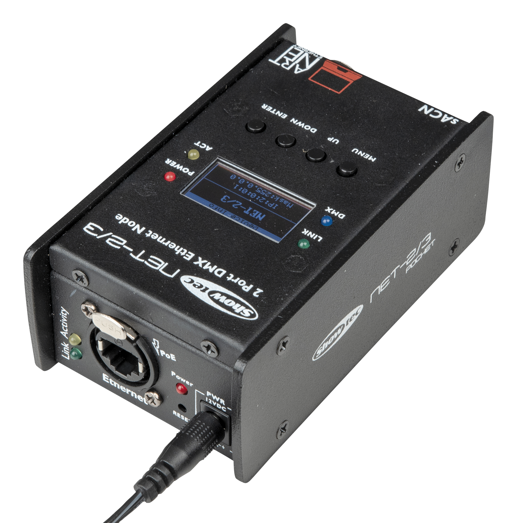 Węzły Showtec NET-2/3 Pocket i NET-2/5 Pocket to najnowocześniejsze urządzenia do routingu sieciowego, które konwertują Art-Net lub sACN na DMX512 i z powrotem. Wejście zasilania może być dostarczane przez POE, co sprawia, że zasilanie 12 V staje się zbędne. Maksymalnie 1024 kanały można przesyłać przez pojedynczy CAT5. Wszystkie ustawienia można wykonać za pomocą łatwego w użyciu menu na wyświetlaczu graficznym i przycisków z przodu. Ustawienia można również wprowadzić za pomocą przeglądarki internetowej, która zapewnia (zdalny) dostęp za pośrednictwem komputera lub laptopa i sieci. Domyślne konto logowania: Admin, hasło: Admin.