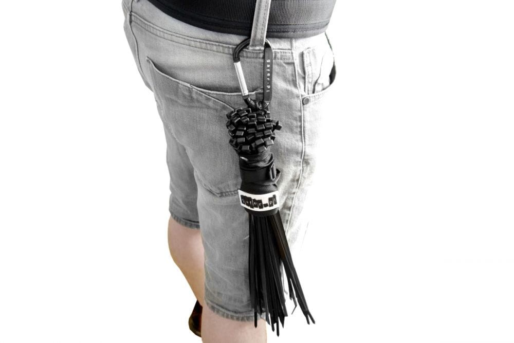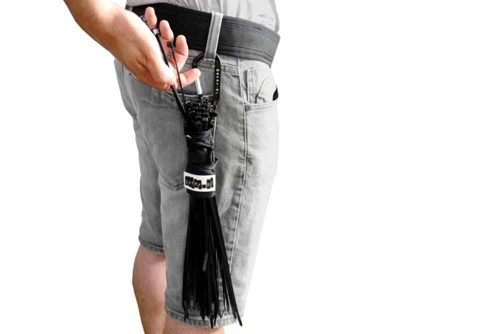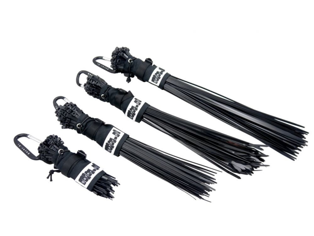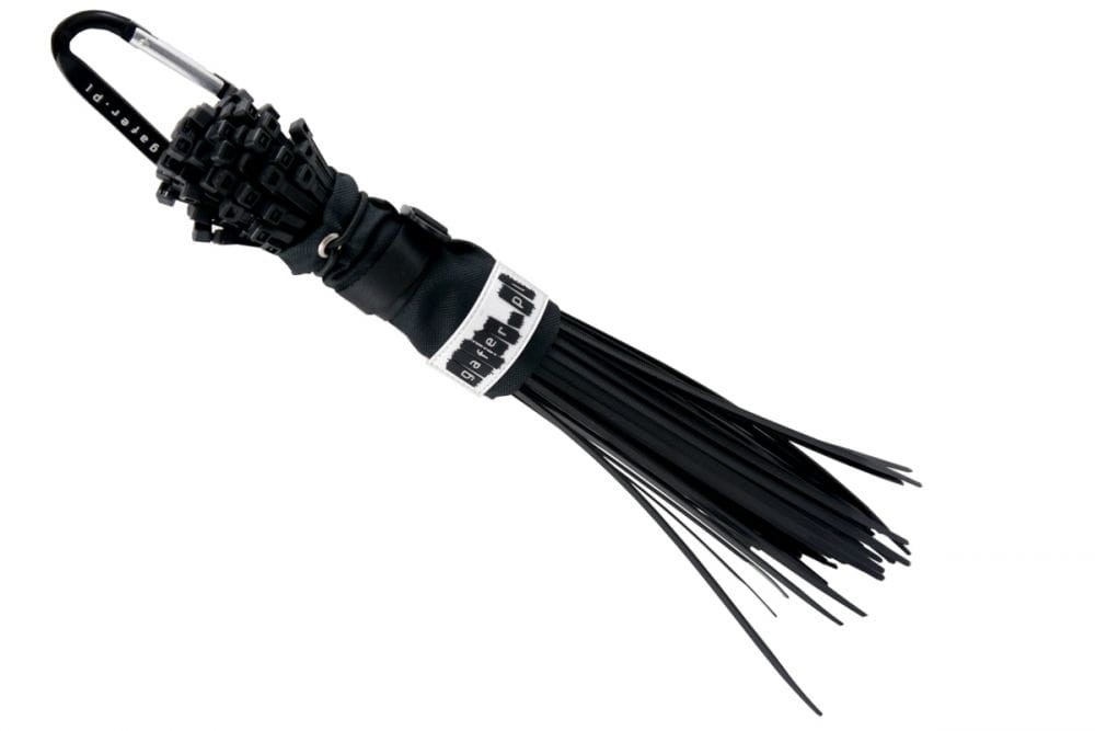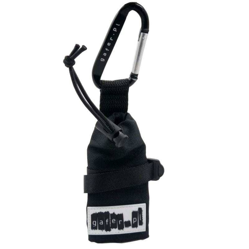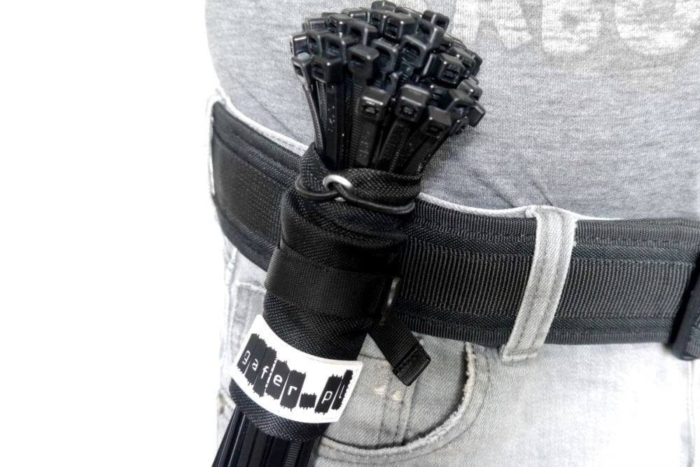 Wyposażony w dwa ściągające paski, które trzymają trytki w jednym miejscu, skutecznie zapobiega ich gubieniu. Pierwszy pasek to rozciągliwa, gumowa linka, która automatycznie naciągnie średnicę torby zaraz po zaciśnięciu. Zabezpieczona została metalowym oczkiem, który nie zniszczy torebki. Drugi pasek jest szerszy, poliestrowy o długości 15 mm, który reguluje średnicę torby i posiada blokadę przed ewentualnym rozciągnięciem. Dzięki niemu uchwyt można przewlec przez pasek od spodni, a dołączony przez nas plastikowy karabińczyk sprawia, że w razie potrzeby możemy go również zapiąć.