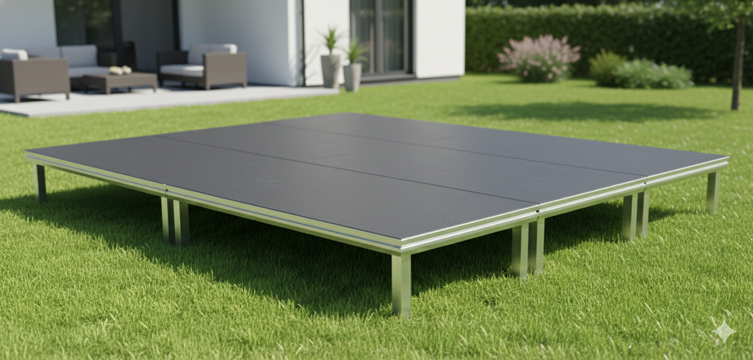 Taras opiera się na sprawdzonej technologii stosowanej w podestach scenicznych używanych w branży eventowej — to rozwiązanie o wysokiej trwałości i odporności na codzienne użytkowanie.