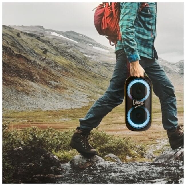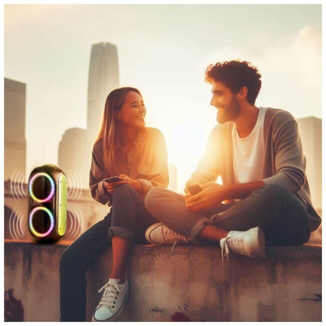 V-tone BeFree to nowoczesna, przenośna kolumna głośnikowa zasilana wydajnym akumulatorem, w zestawie z bezprzewodowym dynamicznym mikrofonem, wyposażona w dwa wejścia gitarowe, dwa wejścia mikrofonowe, wejście AUX, port USB, gniazdo karty TF (microSD), obsługę radia FM, Bluetooth, funkcję nagrywania i wbudowany odtwarzacz audio, a także dwa podświetlane diodami LED głośniki o łącznej mocy 30 watów. Sprzęt doskonale sprawdza się na ✅ domówkach, imprezach plenerowych, podczas wakacyjnych wyjazdów, ognisk i zabaw karaoke z przyjaciółmi, na działce rekreacyjnej, a także jako nagłośnienie dla artystów ulicznych i grup buskingowych.