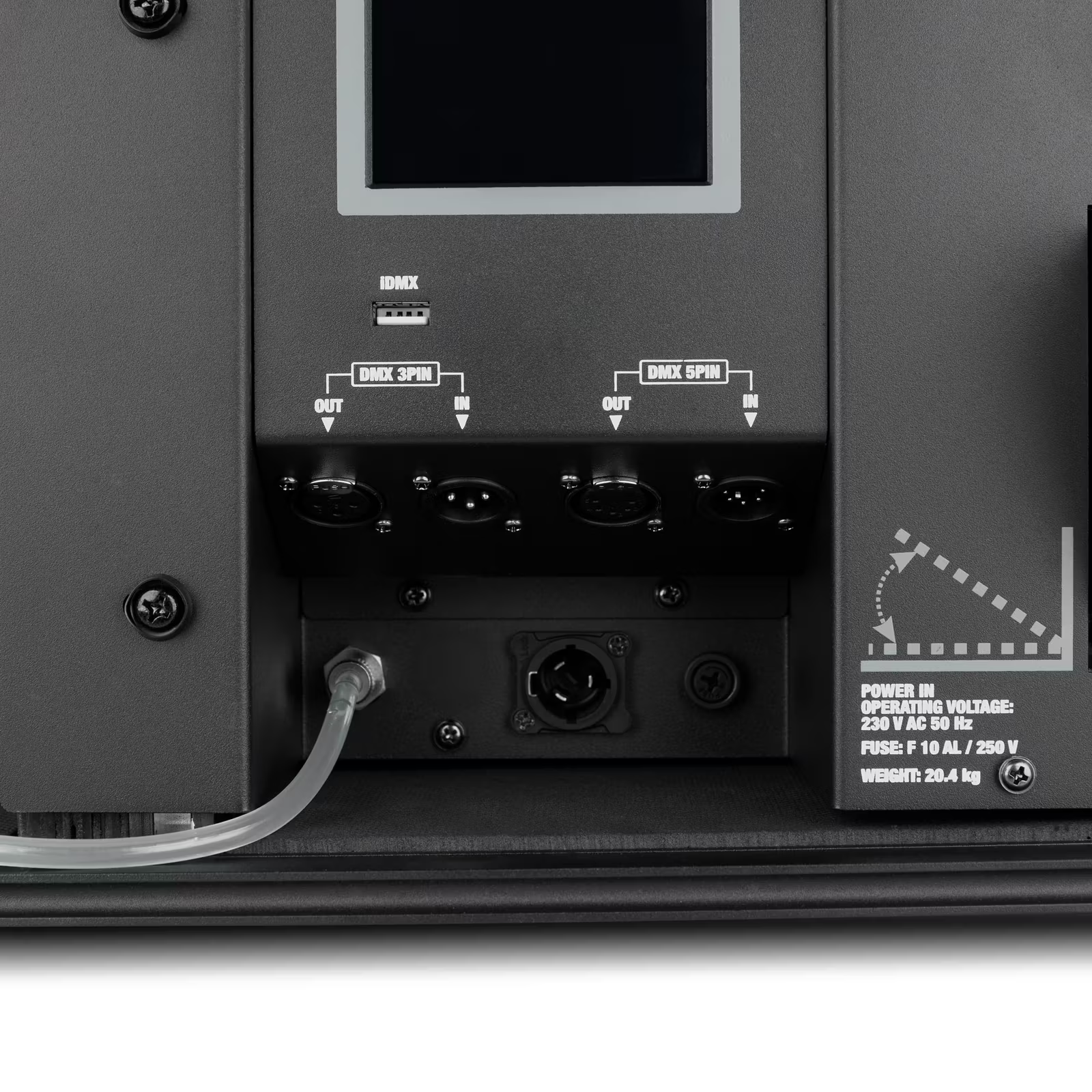 Urządzenie obsługuje 2-kanałowe sterowanie DMX (3- i 5-pinowe złącza) i może działać jako urządzenie autonomiczne (Stand-alone) z funkcją timera. Zintegrowane gniazdo pomieści kanistry z płynem o pojemności do 5 litrów.