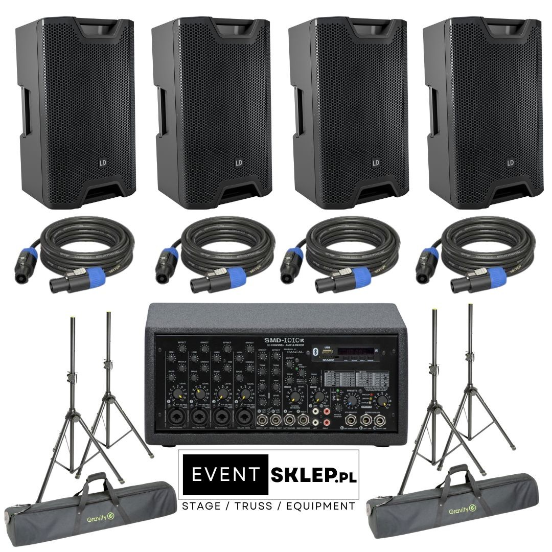 Zestaw nagłośnieniowy: Powermikser LDM SMD-1010R + 4× LD ICOA 12 + statywy Gravity + okablowanie (komplet)
